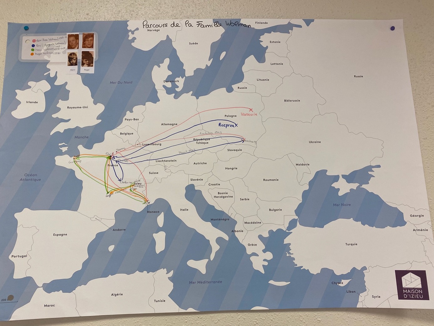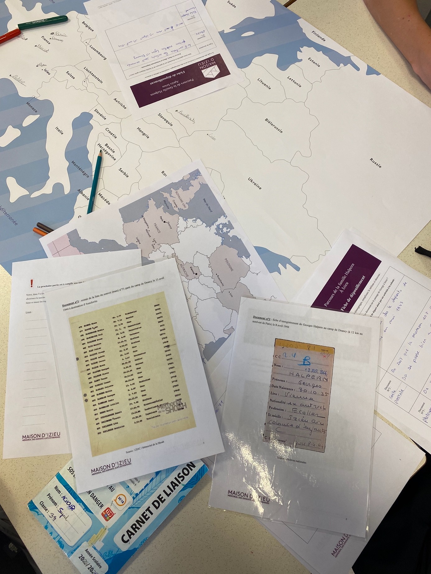 Ce lundi 10 novembre, les élèves des classes de 3eme ont participé 3h durant à un atelier proposé par les médiateurs de la maison d’Izieu. Dans la peau de véritables historiens, les élèves se sont attelés à retracer les parcours de vie, de migration et de déportation de plusieurs familles à partir de documents d’archives (carte d’identité, photo de familles, dessins d’enfants, cartes postales, actes d’arrestation…).
