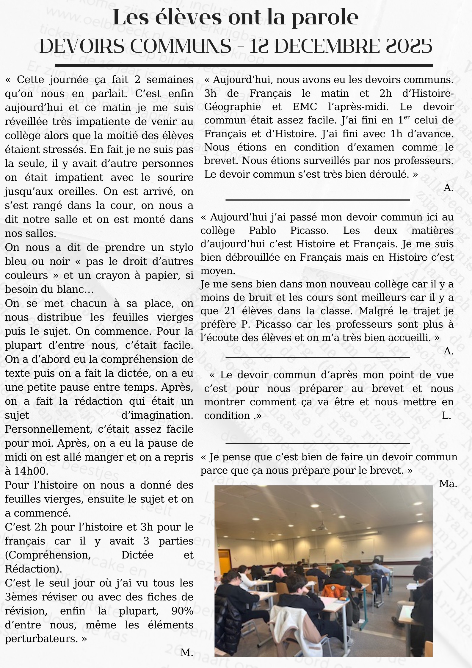 Le vendredi 5 décembre 2025, les élèves de 3ᵉ ont pris part aux devoirs communs de français et d’histoire-géographie/EMC.